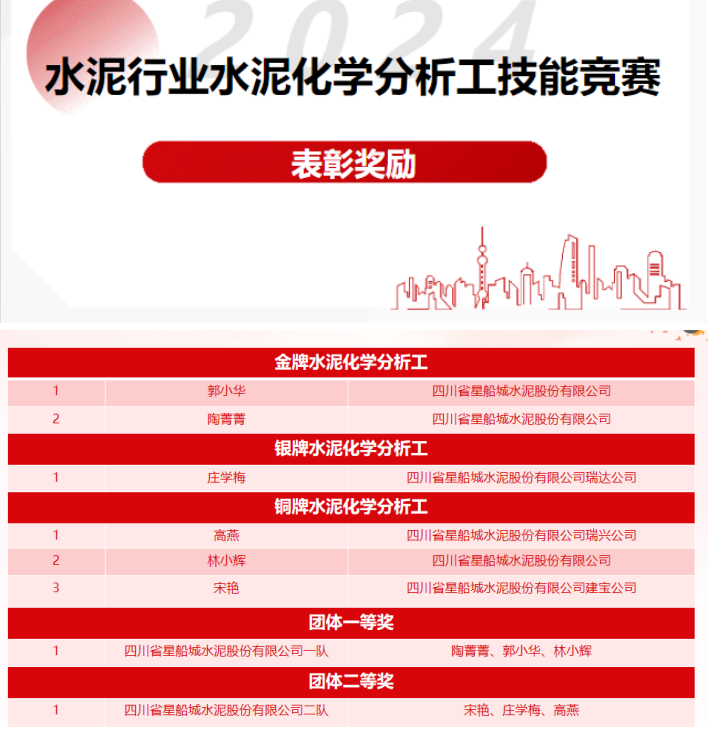 9月24日,由中國(guó)水泥協(xié)會(huì)發(fā)布關(guān)于《2024年水泥行業(yè)水泥化學(xué)分析工技能競(jìng)賽》表彰獎(jiǎng)勵(lì)的決定,對(duì)8月22日至26日,在四川綿陽(yáng)舉行的2024年全國(guó)水泥化學(xué)分析工技能競(jìng)賽中涌現(xiàn)出來(lái)的優(yōu)秀選手和單位進(jìn)行表彰。其中,星船城公司共6名參賽選手在總共60名參加決賽的選手中脫穎而出,郭小華以總成績(jī)第1名、陶菁菁以第3名的成績(jī),榮獲“金牌水泥化學(xué)分析工”稱(chēng)號(hào);莊學(xué)梅榮獲“銀牌水泥化學(xué)分析工”稱(chēng)號(hào);高燕、林小輝、宋艷榮獲“銅牌水泥化學(xué)分析工”稱(chēng)號(hào)。星船城公司一隊(duì)(陶菁菁、郭小華、林小輝)以總成績(jī)第一名榮獲團(tuán)體一等獎(jiǎng);星船城公司二隊(duì)(宋艷、莊學(xué)梅、高燕)以總成績(jī)第八名榮獲團(tuán)體二等獎(jiǎng);實(shí)現(xiàn)全部參賽選手進(jìn)入決賽、全部獲得個(gè)人競(jìng)賽獎(jiǎng)及團(tuán)體一、二等獎(jiǎng)的歷史最佳戰(zhàn)績(jī)。
